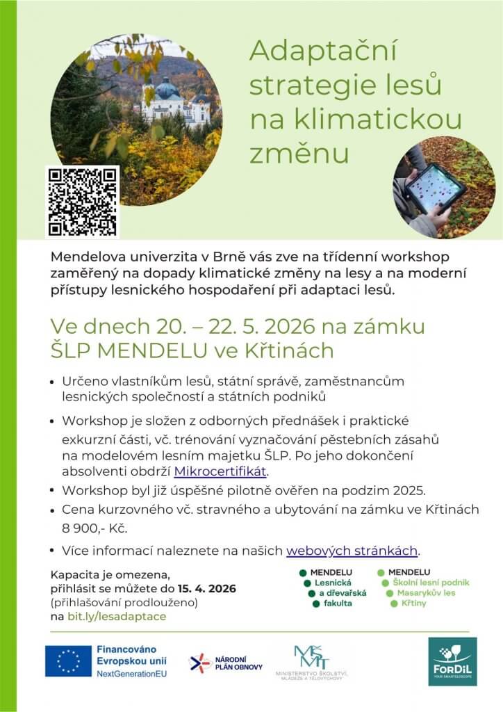 V loňském roce proběhl pilotní běh třídenního workshopu Adaptační strategie lesů na klimatickou změnu. V letošním roce bychom ho rádi nabídli dalším zájemcům z řad možné cílové skupiny: vlastníků lesů zaměstnanců lesnických firem,…13. 2. 2026 -