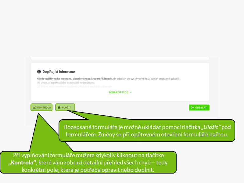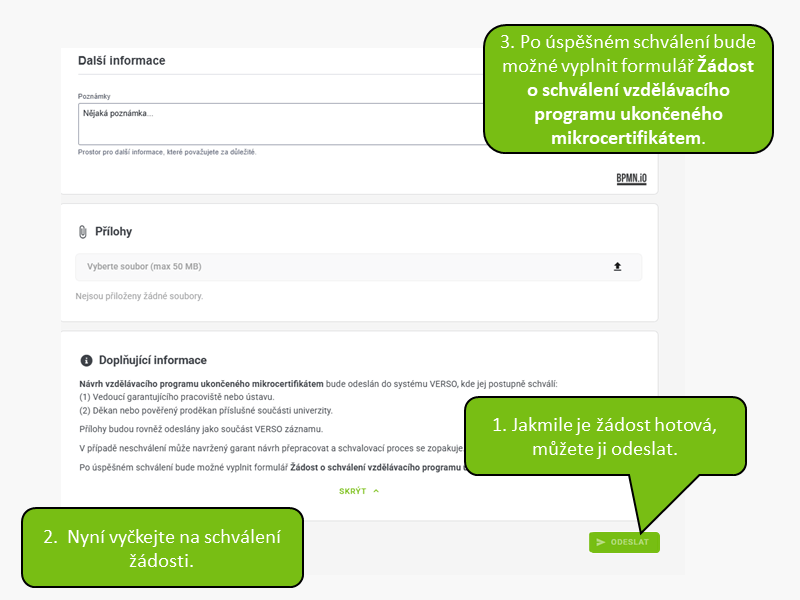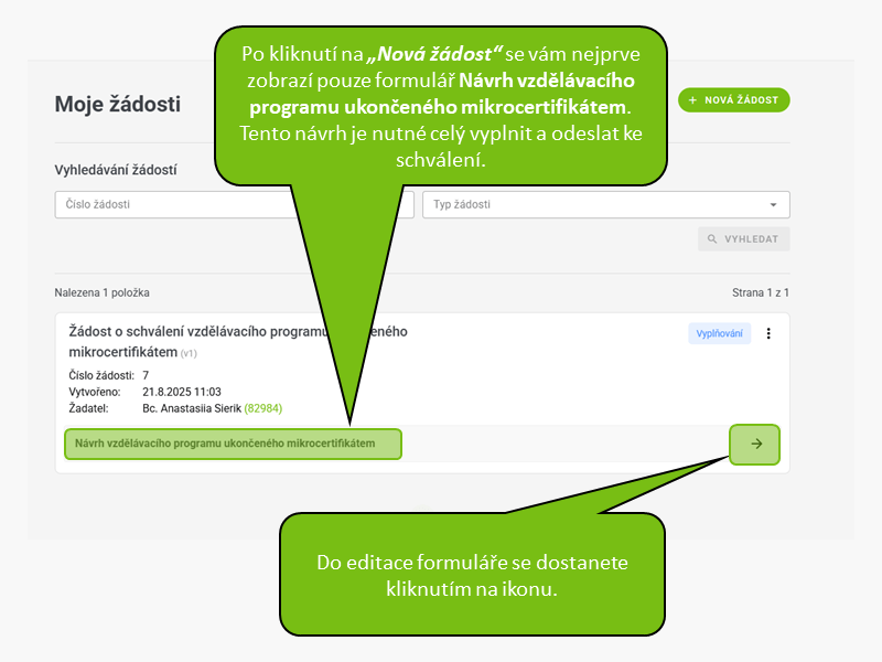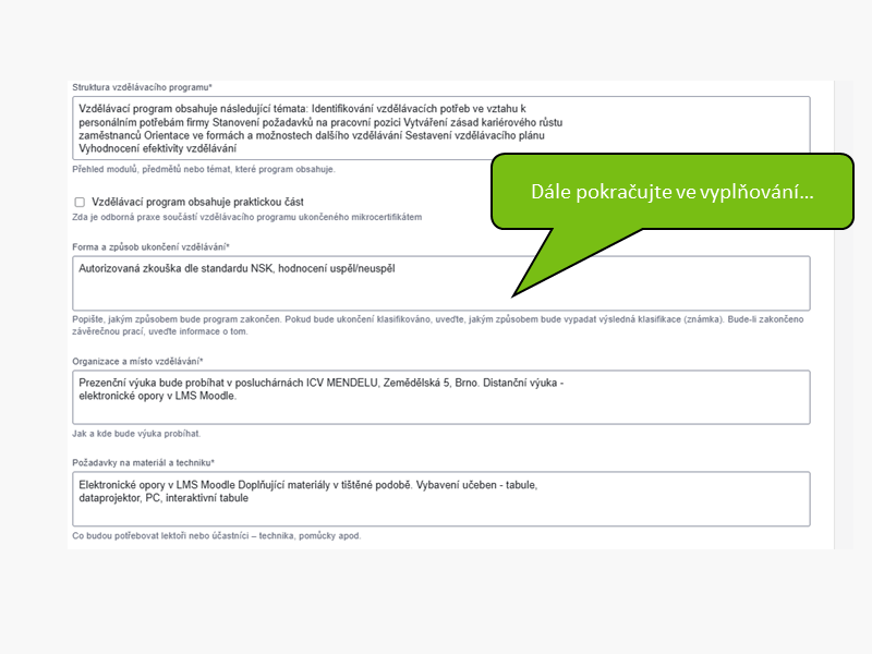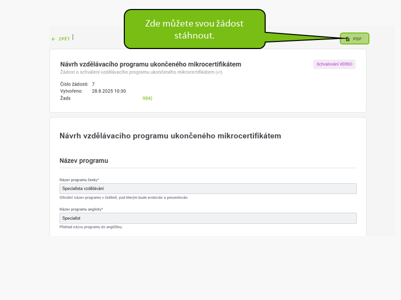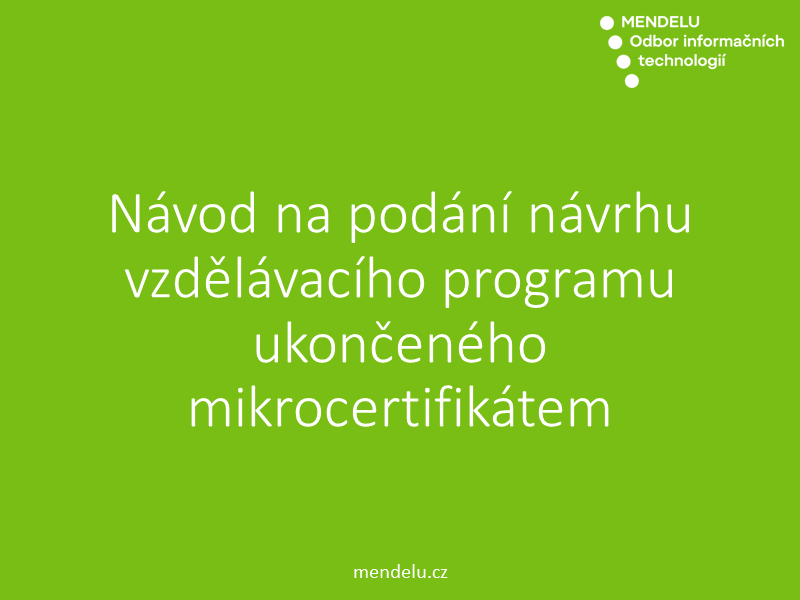 Podrobnější návod k podání NÁVRHU VZDĚLÁVACÍHO PROGRAMU ukončeného mikrocertifikátem a návod k podání ŽÁDOSTI O MIKROAKREDITACI VZDĚLÁVACÍHO PROGRAMU ukončeného mikrocertifikátem jsou uvedeny níže: