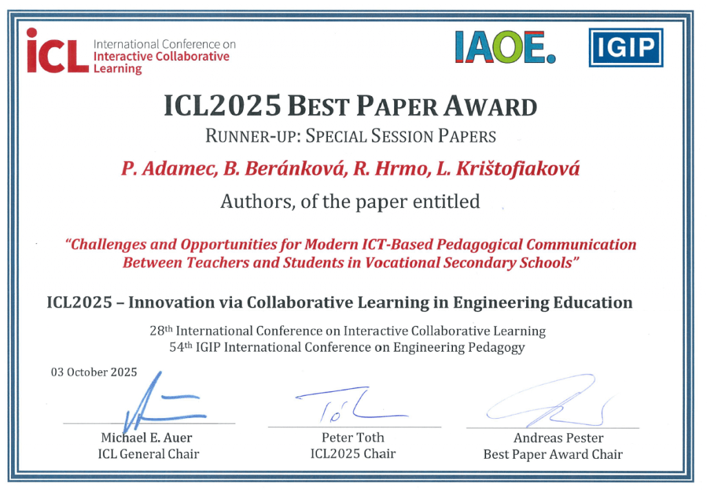 Petr Adamec přednesl příspěvek Challenges and Opportunities for Modern ICT-Based Pedagogical Communication Between Teachers and Students in Vocational Secondary Schools a David Kryštof vystoupil s příspěvkem The TAPATE Model as an Example of Teacher Development in Engineering Pedagogy. Oba příspěvky budou publikovány ve sborníku vydaném v prestižním nakladatelstvím Springer, který je indexován v databázi Scopus.